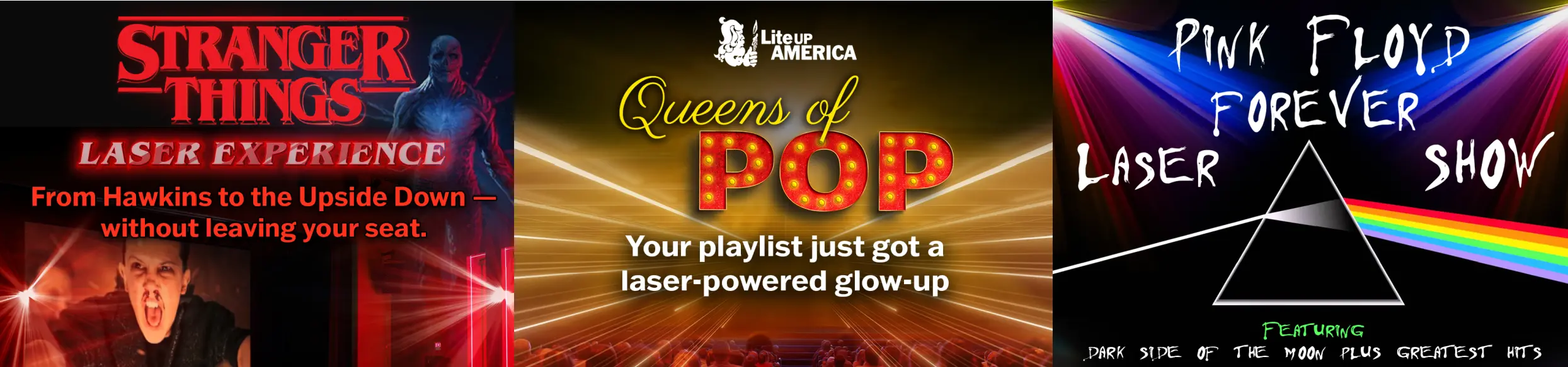 Step into the world of Hawkins like never before with Lite Up Americaโs Stranger Things Laser Experience โ a mind-blowing fusion of light, music, and storytelling. This immersive show brings the Upside Down to life with breathtaking laser effects, synchronized to the seriesโ iconic 80s-inspired soundtrack.